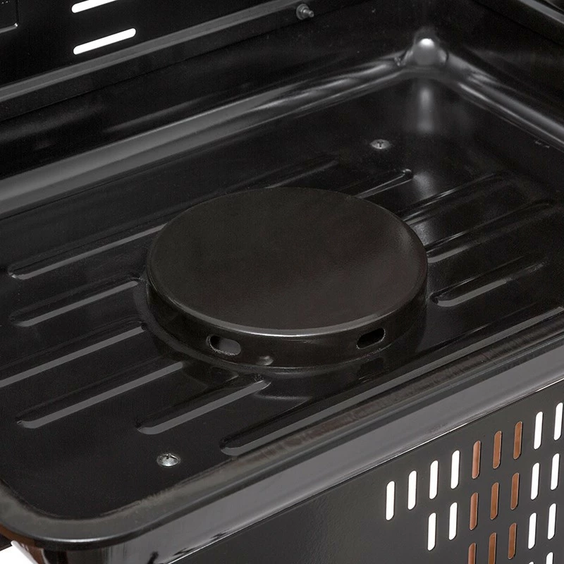 Il offrira tous les avantages que peut vous donner un barbecue à charbon ! Il comprend une cuve rectangulaire et une desserte en bois destiné aux aliments et aux accessoires.