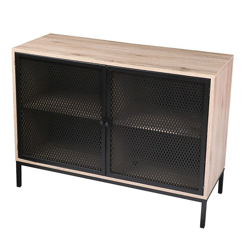 Buffet en métal et imitation bois de hauteur 75 cm. Ce buffet est composé de deux portes effet grillage avec étagère intérieure. Idéal pour ranger votre vaisselle par exemple.