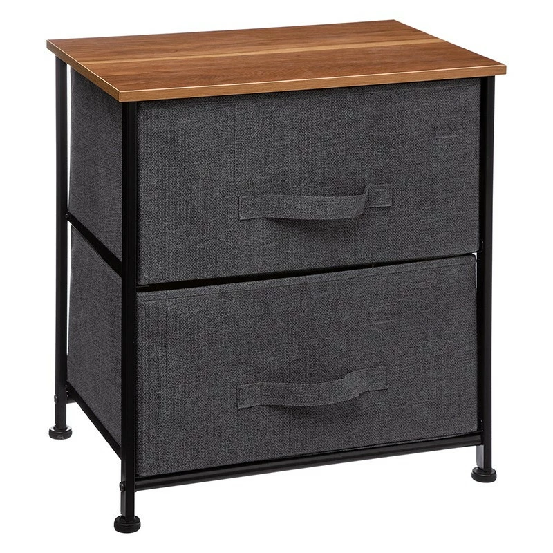 Chevet à 2 tiroirs en tissu gris foncé, plateau en fibres de bois et structure en métal noir.