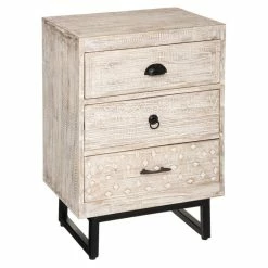 Ce chevet est composé de 3 tiroirs en bois blanchi. Les pieds sont en métal noir.