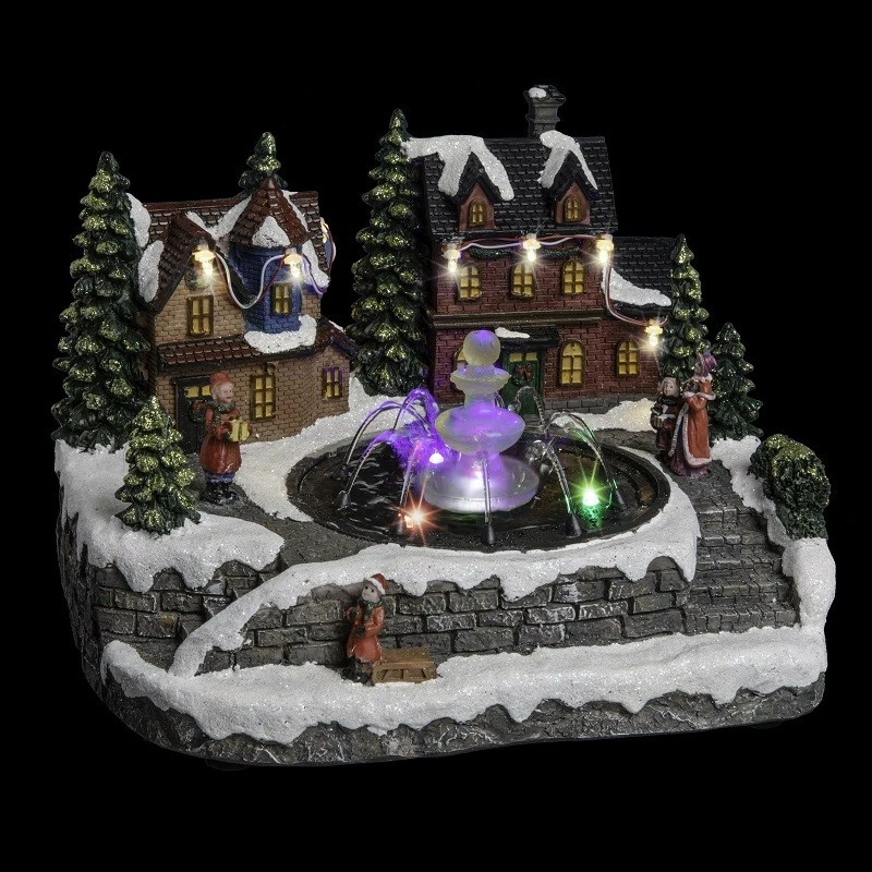 Village décoration de Noël avec véritable fontaine à eau dans le thème « En ville ».