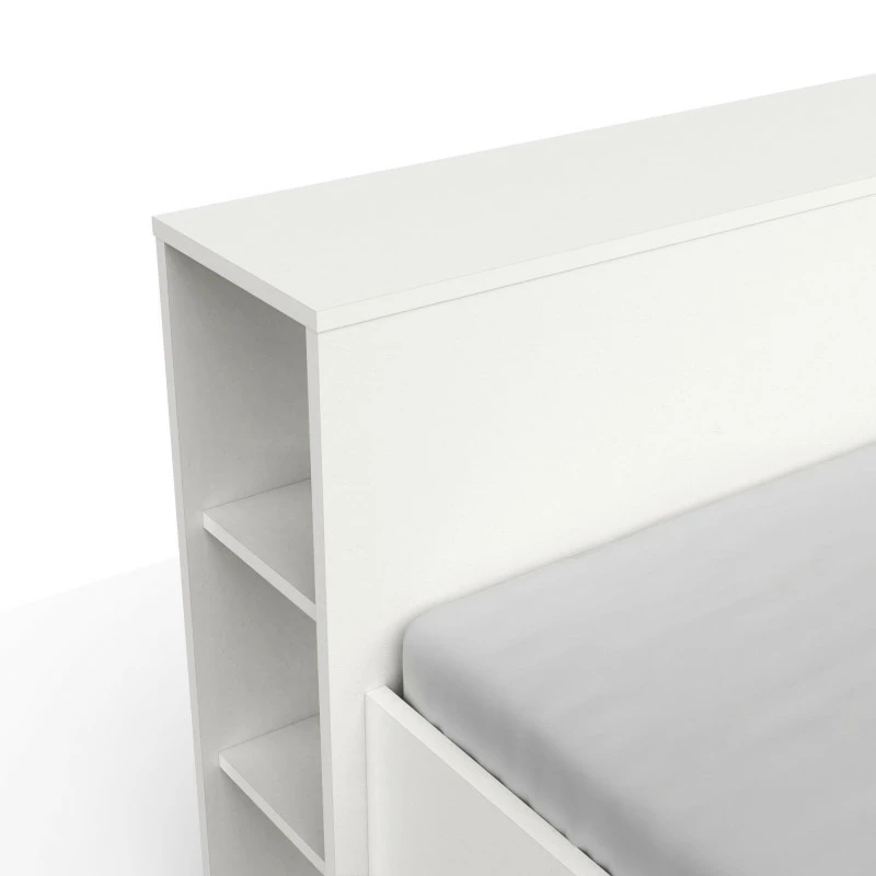 De plus, la tête de lit (E. 23,9 x H. 76 cm) dispose d’étagères latérales : parfaites pour remplacer les tables de chevet par exemple !
