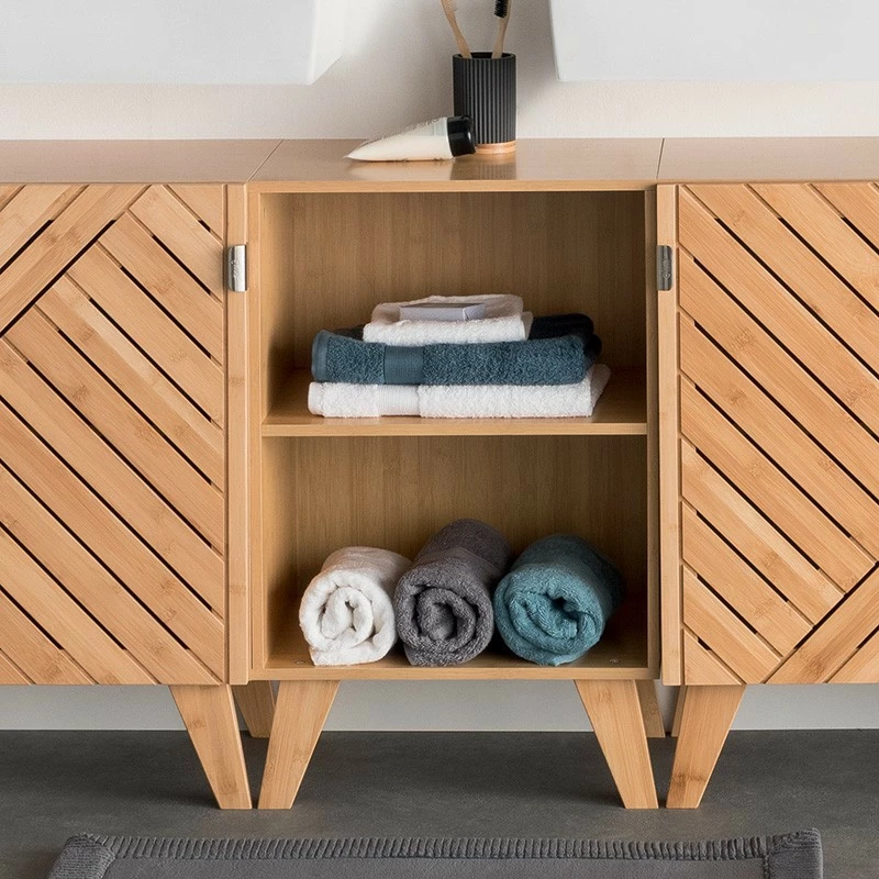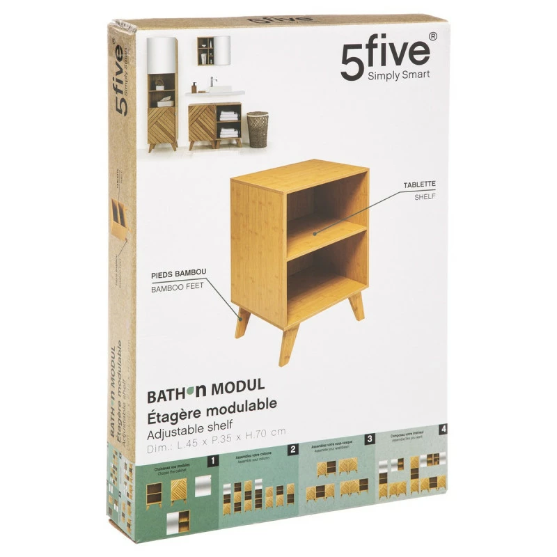 Ce meuble étagère peut être monté sur des pieds (H. 15 cm) bambou pour être posé au sol. Il peut également composer une colonne en étant associé verticalement à d’autres modules, comme visible sur les photos d’ambiance.