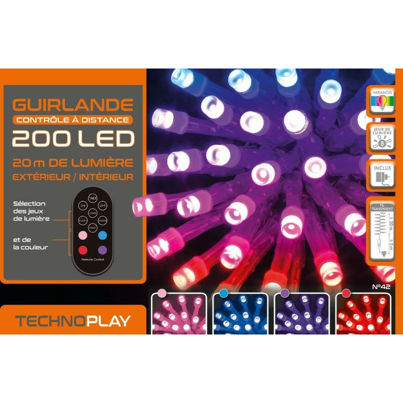 Guirlande programmable & contrôle à distance 200 LED 20 mètres variation de couleurs qui bénéficie de tous les avantages possibles ! En effet, vous pourrez, grâce à sa télécommande magique, choisir le coloris que vous souhaitez avoir (entre rose, bleu, violet et rouge) ainsi que votre jeux de lumière préféré parmi les 8 proposés. Idéal pour changer d’ambiance selon vos envies ! Grâce à la fonction TIMER, vous pourrez la lancer automatiquement pendant 8 heures continues et elle recommencera ainsi tous les jours ! Enfin, elle se disposera aussi bien à l’intérieur qu’à l’extérieur grâce à sa grande résistance au froid.