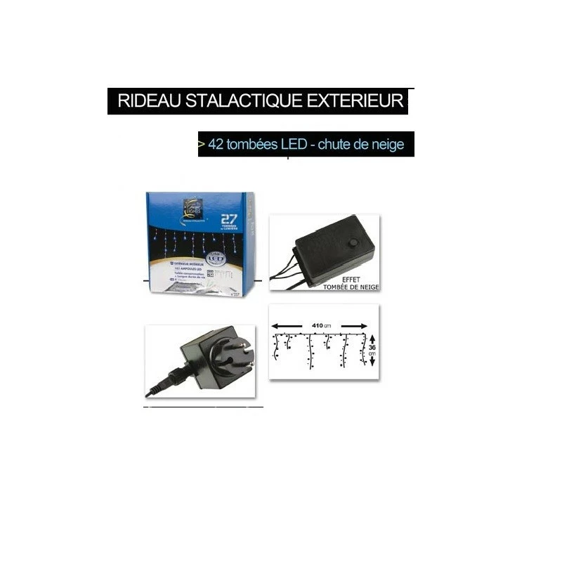Guirlande pour l’extérieur et l’intérieur composée d’un fil de 410 cm de long à poser horizontalement sur lequel sont accrochées 42 tombées de lumière de hauteurs différentes, effet stalactite (hauteur maximale 36 cm) + cordon d’alimentation de 800 cm de long.