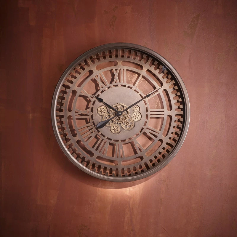 Créez votre tendance avec cette horloge grand modèle avec rouages apparents en mouvement.