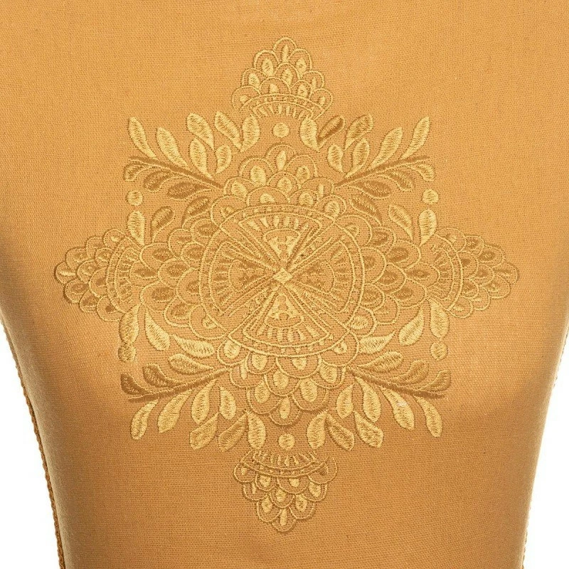 Revêtu d’un tissu lumineux orné d’un liseré contrasté sur les côtés et d’un motif floral ton sur ton brodé sur le devant.
