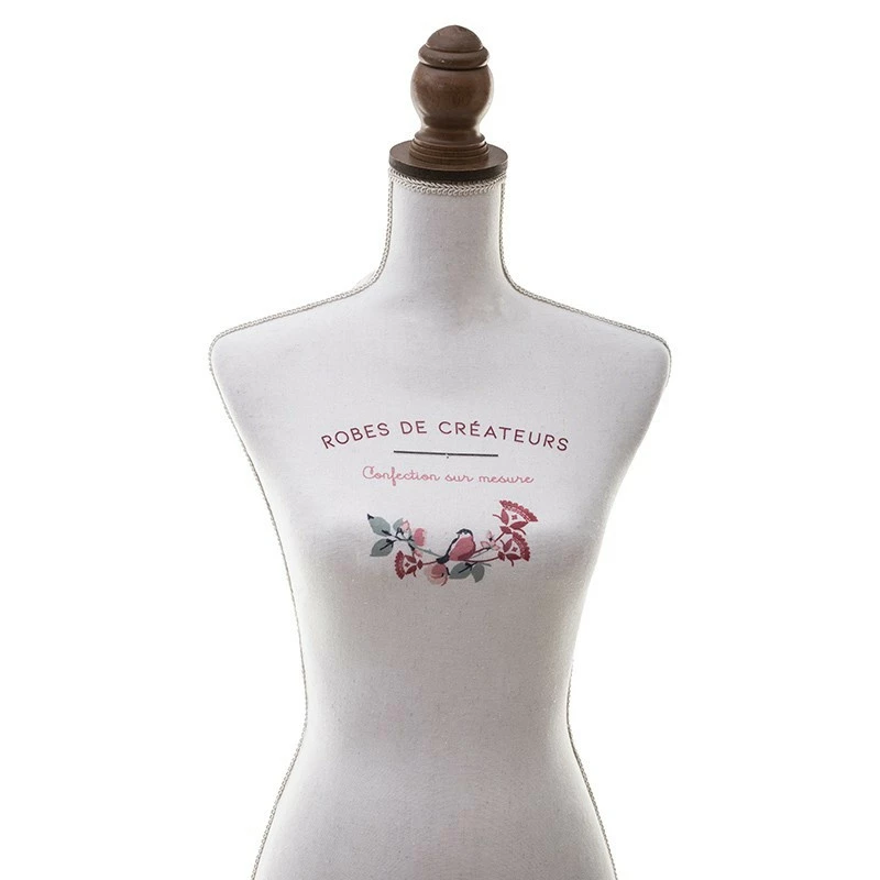 Mannequin de couture de la marque Atmosphera. Ce buste, grandeur nature mesure 160 cm. Sur le devant, on peut lire : « Robes de créateurs » est « Confection sur mesure ». Au dos, le motif est fleuri pour un effet romantique. Très décoratif, les mannequins sont l’objet charme dans une chambre ou un bureau !