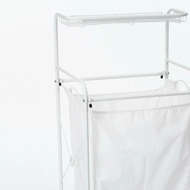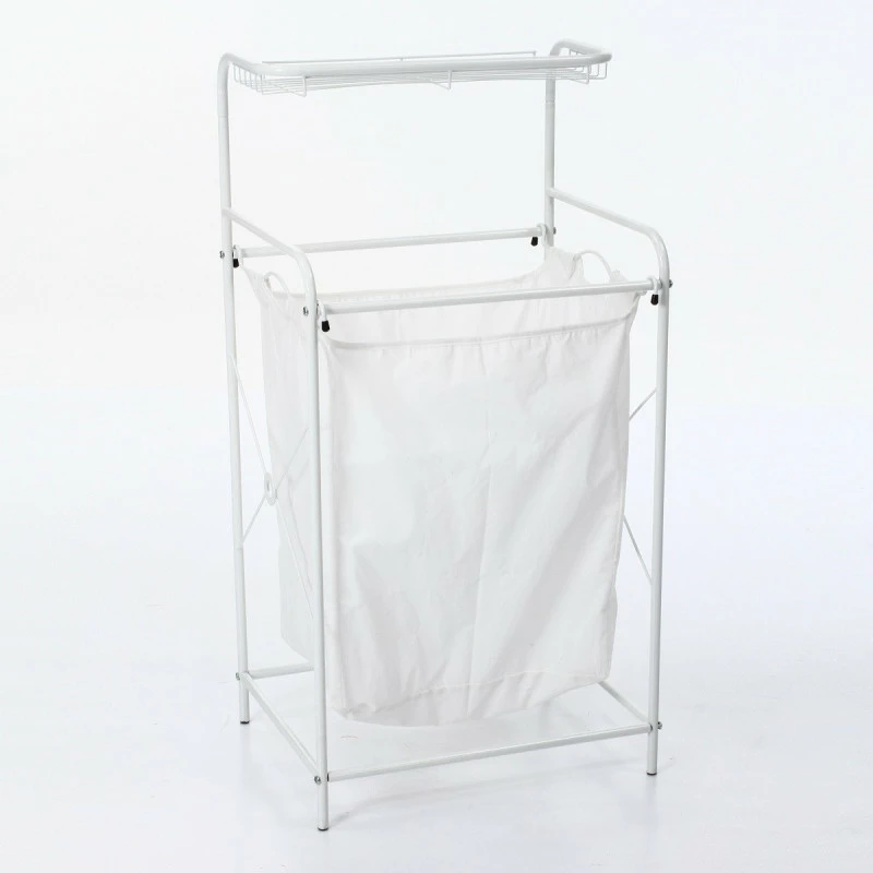 Composé d ‘une structure métallique supportant un panier à linge sale lavable amovible avec crochets + 1 étagère sur la partie supérieur. A monter soi-même.