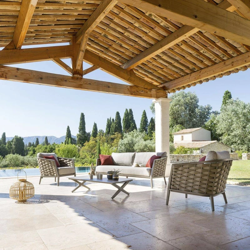 La structure praline en aluminium traité époxy antirouille apporte beaucoup d’élégance à ce salon.