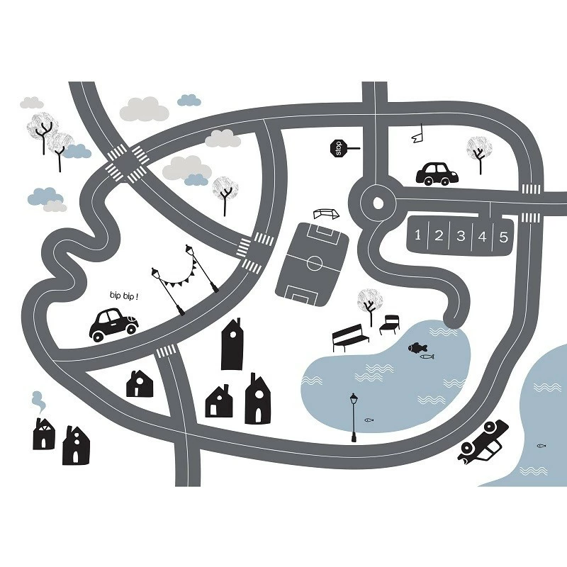 Plateau décoré avec un plan d’une ville avec un circuit pour voitures.