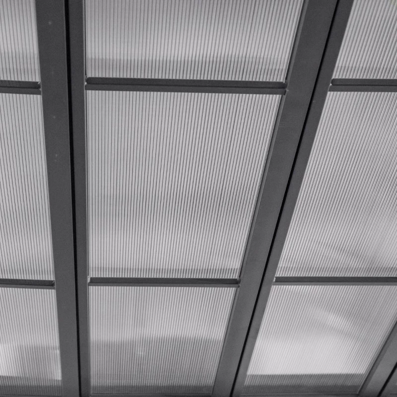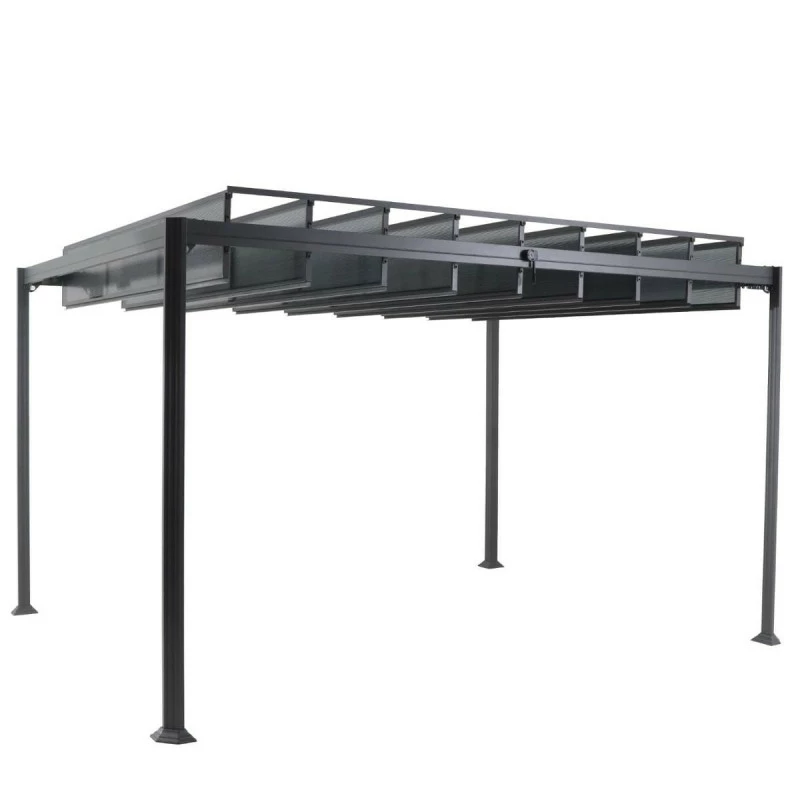 Vous pourrez régler l’intensité lumineuse grâce à son toit à lattes orientables en polycarbonate. Ouverture et fermeture par manivelle.