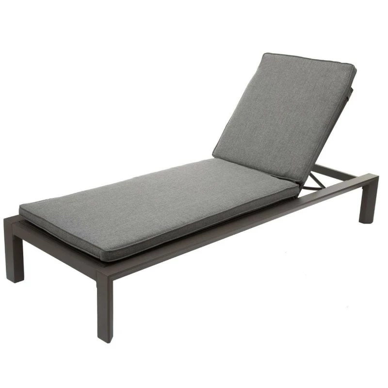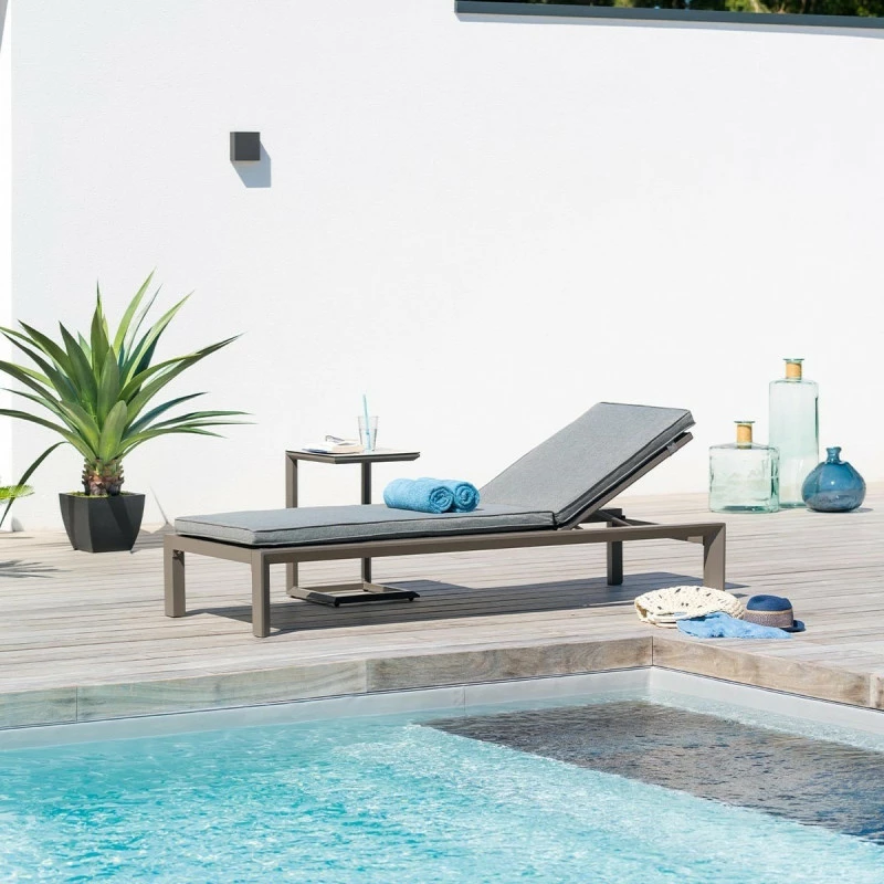 Une création Hespéride, le transat Evasion structure en aluminium tonka et coussin wengé inclus.