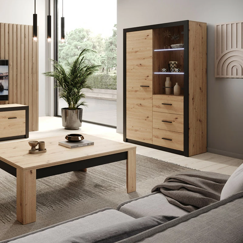 La vitrine dispose d’une porte pleine avec 5 étagères intérieures et d’une porte vitrée avec 2 étagères intérieures vitrées.